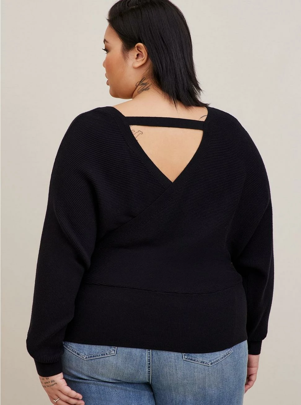 - Deep V-neck.